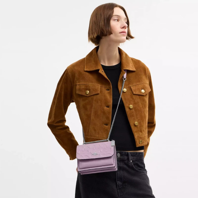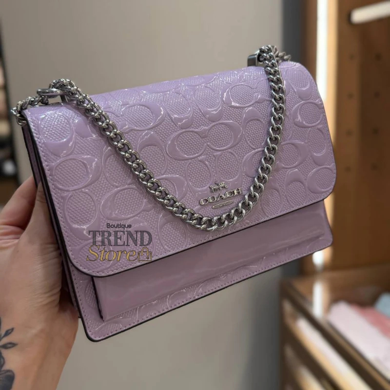 Ese mini bolso que ilumina cualquier look. El Mini Klare de Coach en cuero charol Signature light violet tiene ese brillo elegante que lo hace destacar al instante. Es compacto, sofisticado y perfecto para usar de día o de noche.