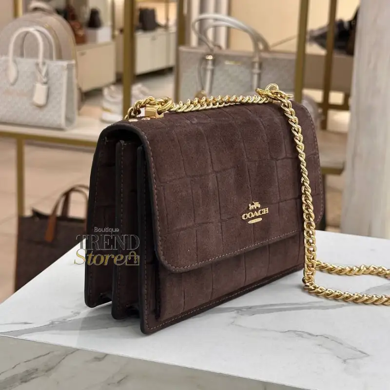 La Coach Mini Klare Crossbody Bag es una cartera compacta y sofisticada, diseñada para mujeres que buscan un accesorio elegante con carácter. Confeccionada en suede con relieve tipo cocodrilo, combinada con cuero liso, ofrece una textura única y un acabado de lujo que destaca a primera vista.