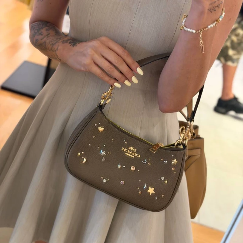 Ese modelo que mezcla lo clásico con un toque más atrevido y simplemente funciona perfecto. La Teri de Coach con tachas es de esas carteras que elevan cualquier look, dándole un aire moderno pero siempre elegante.