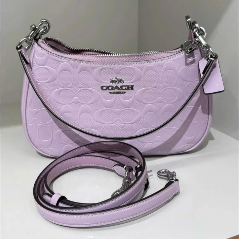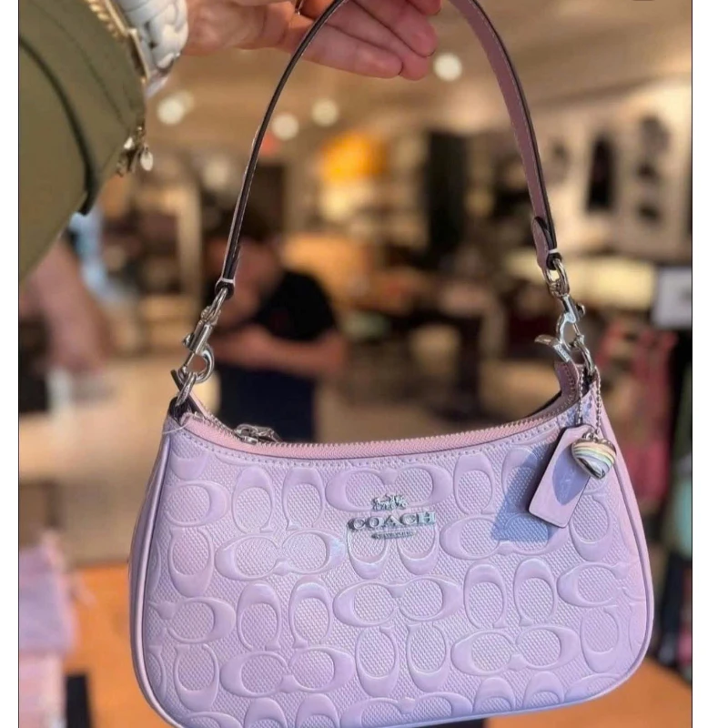 La cartera Teri Shoulder Bag de Coach en versión Signature leather con acabado charol perlado es una pieza moderna, elegante y versátil. Disponible en Trendstore Chile, este modelo en tono light violet con heart charm combina diseño icónico con un toque femenino y sofisticado.