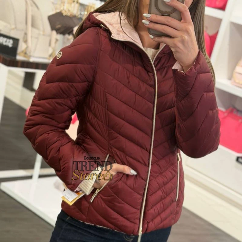 La chaqueta Michael Kors Chevron Reversible en tono burdeo con monograma rosa es una prenda versátil y sofisticada, diseñada para adaptarse a distintos estilos con un solo diseño. Disponible en Trendstore Chile, este modelo destaca por su formato reversible, ideal para quienes buscan funcionalidad sin renunciar al estilo.