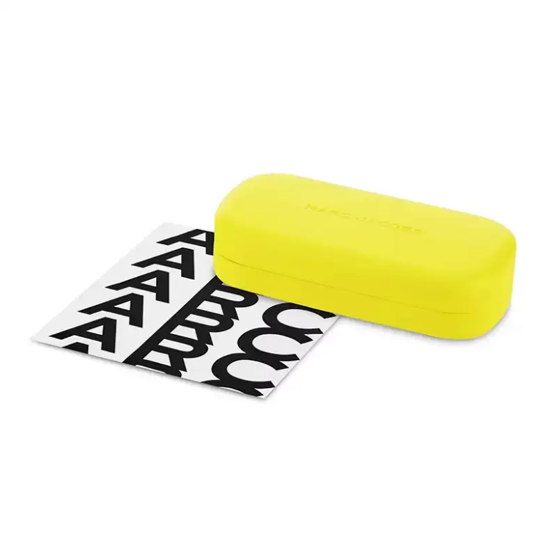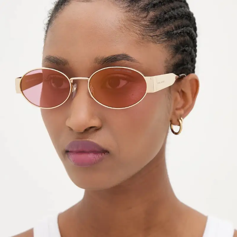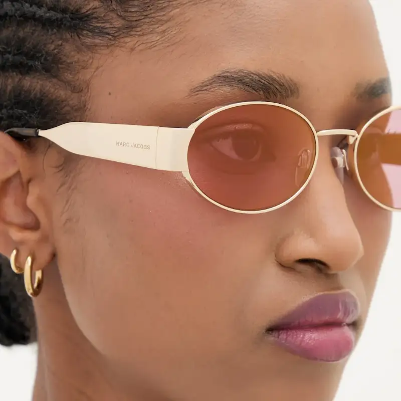 Este diseño destaca por sus lentes ovalados en tono rosa, que armonizan perfectamente con la montura fabricada en una combinación de metal y plástico. Las patillas anchas en color dorado brillante aportan un carácter distintivo y elegante, mientras que el logo Marc Jacobs, discretamente incorporado, refuerza la identidad exclusiva del modelo.